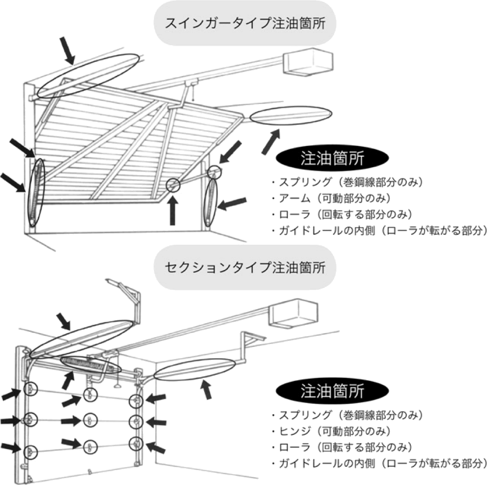 * Đảm bảo rằng trong quá trình tra dầu các phụ kiện, điều khiển từ xa của của không hoạt động. Vì nếu cửa được sử dụng sẽ gây nguy hiểm trong quá trình tra dầu.