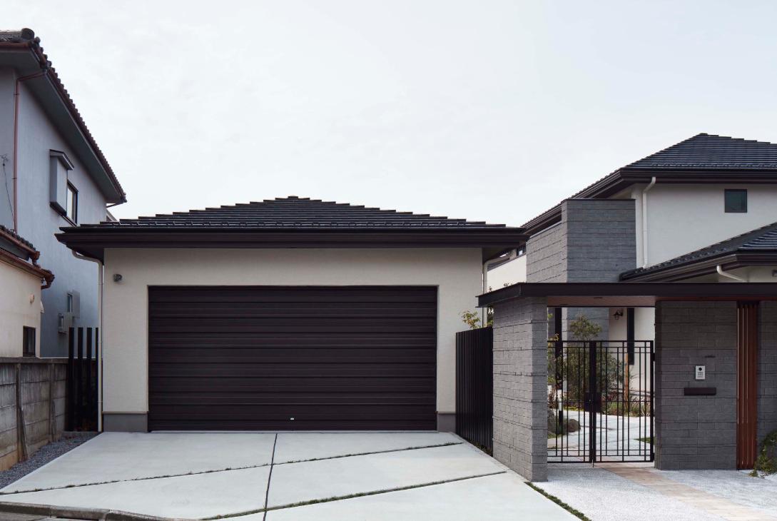 Vì toàn bộ phần mái của khối garage và khối nhà ở, khu vực cổng, cũng như hai chiếc xe bên trong garage đều được thống nhất với tông màu đen, nên cửa garage sơn đen cũng hòa hợp với tổng thể công trình, tạo nên một không gian garage sang trọng, trầm lắng.